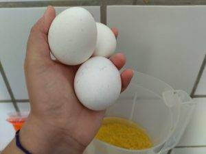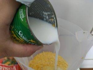 Acrescente leite, 3 ovos, flocão de milho e açúcar. Agora é só bater tudo no liquidificador até ficar homogêneo.