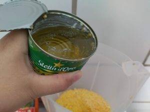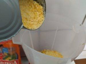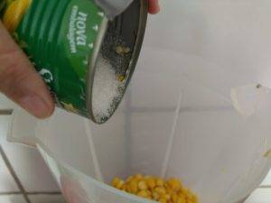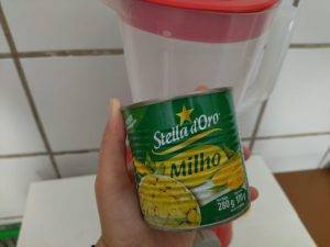 Escolha a lata de milho de sua preferência. Em seguida, escorra a água de dentro dela e ponha somente o milho no liquidificador.