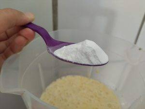 Por último, acrescente uma colher de sopa de fermento em pó e bata no modo pulsar, apenas para misturar.