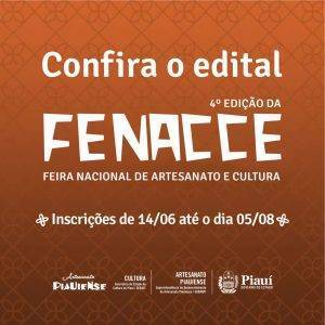O edital de chamamento de nº 003/2022 lançado pela Secult por meio da Sudarpi seleciona artesãos para a Feira Nacional de Artesanato e Cultura. O chamamento tem o objetivo de selecionar 10 artesãos interessados em participar da Fenacce e o período de inscrição se estende até dia 5 de agosto de 2022.