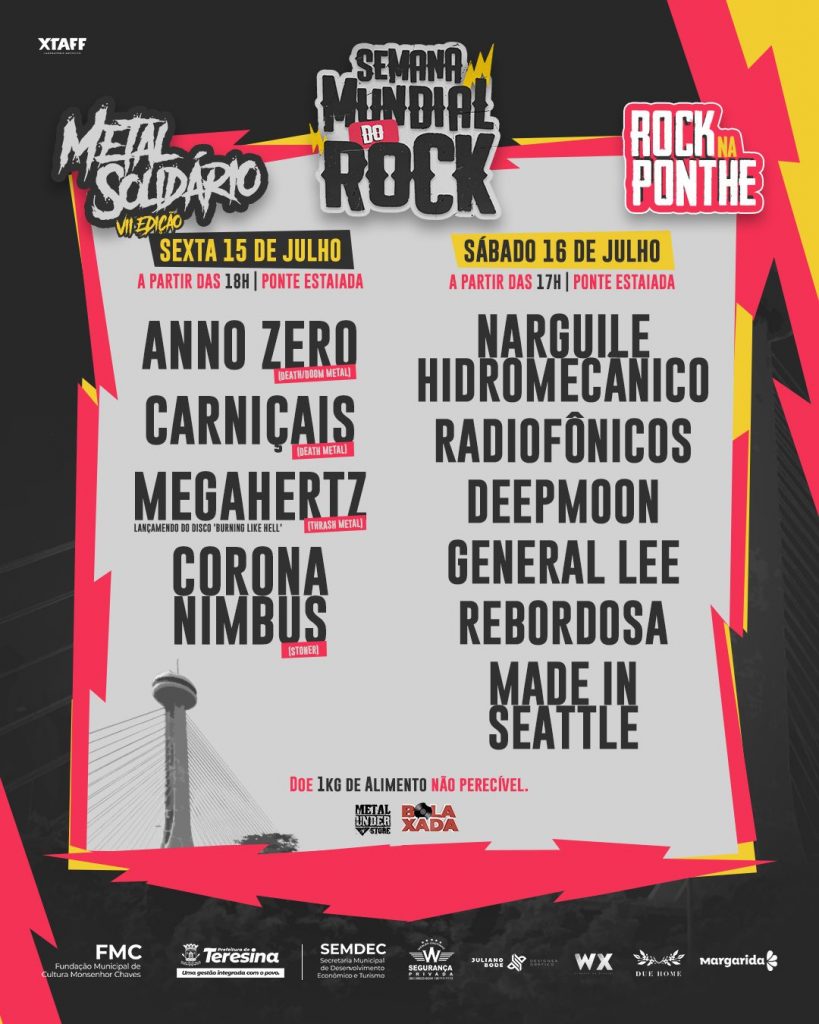 O dia do Rock é celebrado no dia 13 de Julho desde 1985. E foi pensando nesse dia que surgiu a semana que vai promover uma interação entre diversos estilos da Música – Rock de Teresina. No primeiro dia as bandas Anno Zero, Megahertz Band, Carnicais e Corona Nimbus se apresentarão na VII edição do Metal Solidário. Já no segundo dia o púbico contará com a presença das bandas Narguilé Hidromecânico, Deepmoon Band, Os Radiofônicos, Rebordosa Band, General Lee Band e Made In Seattle no Rock na Ponthe.