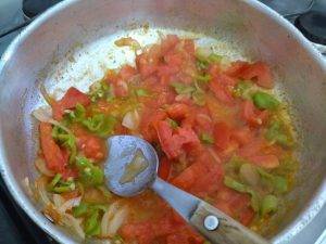 Depois vamos passar para os temperos. Eu refoguei na manteiga, 1 cebola, 3 pimentas de cheiro, 1 tomate e 2 dentes de alho. Coloque na massinha e tempere com os temperos secos de sua preferência. Eu coloquei sal, pimenta do reino, corante para dar uma cor e um pouco de açafrão, além de picar cheiro verde, para deixar nosso hambúrguer bem apetitoso.