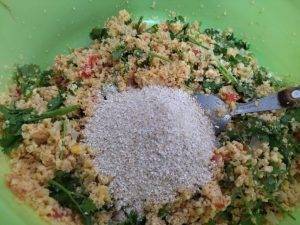 Misture bem isso tudo. Pensando em tornar a receita mais nutritiva do que ela já é, acrescentei 1 xicara de farinha de aveia e 1 colher de gergelim.