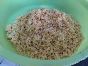 Agora é um ponto importante. Se você tiver um liquidificador potente, pode usá-lo para triturar os grãos. Mas se esse não for o caso, vai precisar de um processador. Escorra a água da tigela e coloque os grãos no processador ou liquidificador potente. Neste momento, queremos que eles virem uma massinha molhada.