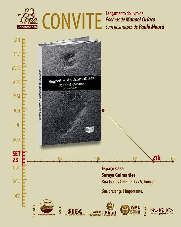 O projeto de arte e cultura do Piauí “O Poeta e sua Hora” fará uma programação recheada de arte, música, regada a literatura e poesia na próxima sexta-feira (23/09), a partir das 21 horas, no Espaço Casa Soraya Guimarães, que fica na Rua Genes Celeste, 1776, bairro Ininga, em Teresina. A atração será o lançamento do livro de poesias do poeta e publicitário Manoel Ciríaco, “Segredos da Ampulheta”.