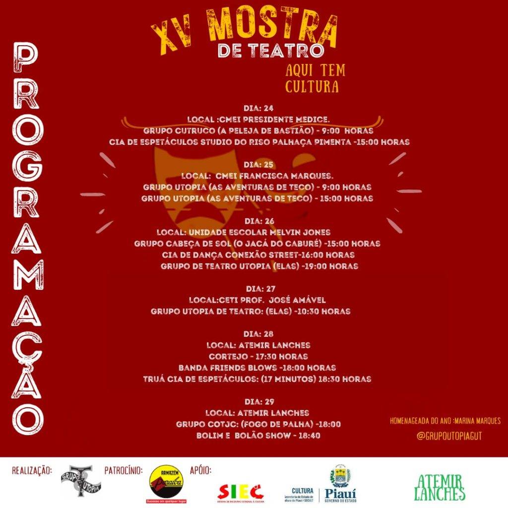 “A Mostra é inicialmente uma forma de descentralização de movimentos culturais, fazendo com que a arte possa fazer parte do cotidiano da comunidade e assim fazer o movimento de formação de plateia”, pontua Chico Borges (Coordenador da Mostra e Direto do Grupo Utopia de Teatro).
