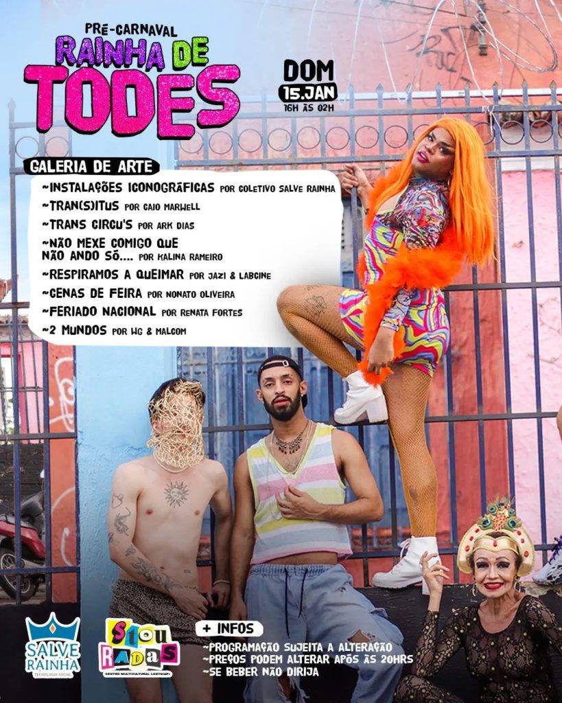 E no dia 15 de janeiro (domingo) o coletivo promoverá uma grande festa para marcar esse retorno das atividades presenciais. O “Salve Rainha de Todes” acontece nas prévias de carnaval do Centro Multicultural @Stouradas (Rua Lisandro Nogueira, 1310, Centro), às 16h. E conta com apresentação musical de MathGabe, Transtorno, Os the pé inchado, Bloco Onun, DJ Buarky (SP), DJ Hiperbolar e performances de Isabelita Kennedy.