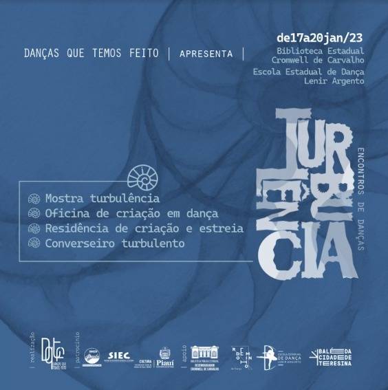 Turbulência Encontros de Danças é uma realização da Plataforma de Criação, Produção e Formação “Danças Que Temos Feito”, através do Projeto Turbulência, aprovado pelo Sistema de Incentivo Estadual à Cultura (SIEC) 2022, Secretaria de Estado de Cultura do Piauí (SECULT) e Armazém Paraíba.