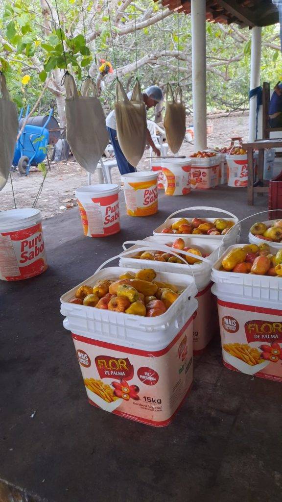 3) Depois, é triturado ou prensado para a extração do suco do caju;