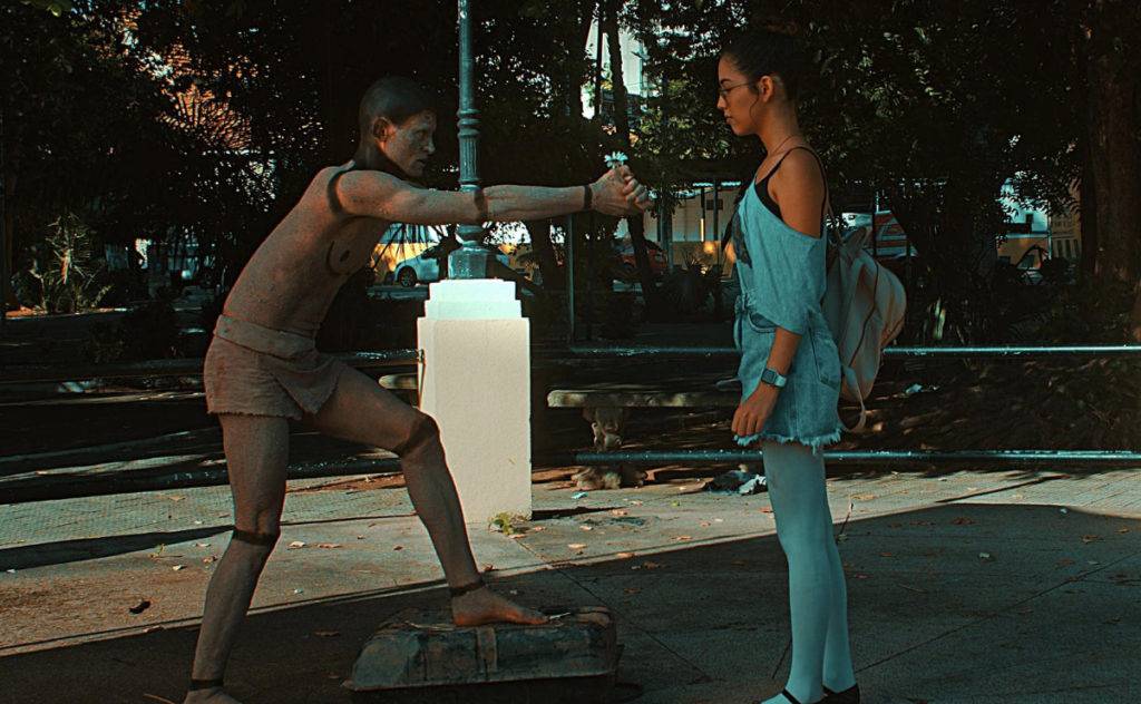Existe um curto e pequeno espaço no cotidiano desse personagem que se transforma na pausa diante de todos os males. Nesse micro espaço onde o artista performa, onde ele transforma a estranheza em espetáculo, é onde podemos sentir que os estalos deixam de ser uma mácula. Antes e depois de subir no pequeno palco, a expressão e o corpo cabisbaixo contrastam com a imponência da estátua viva.