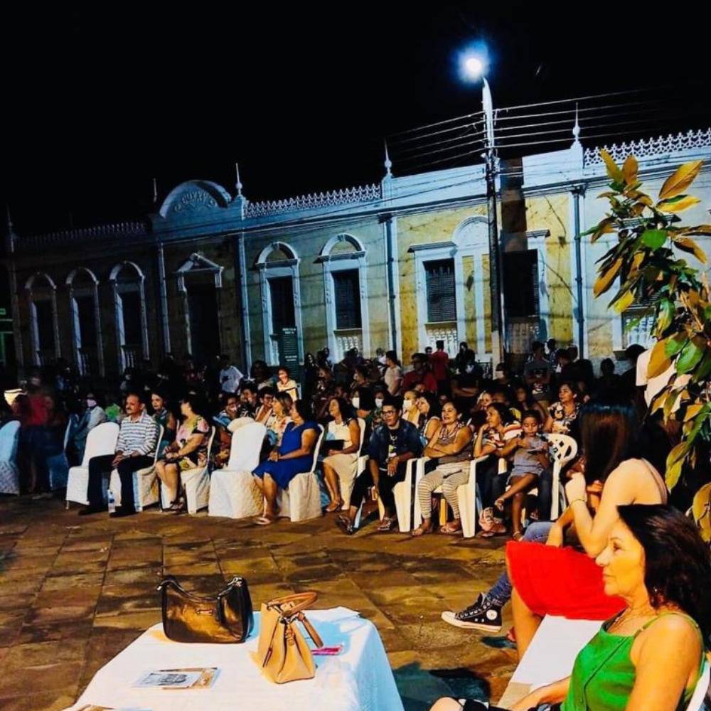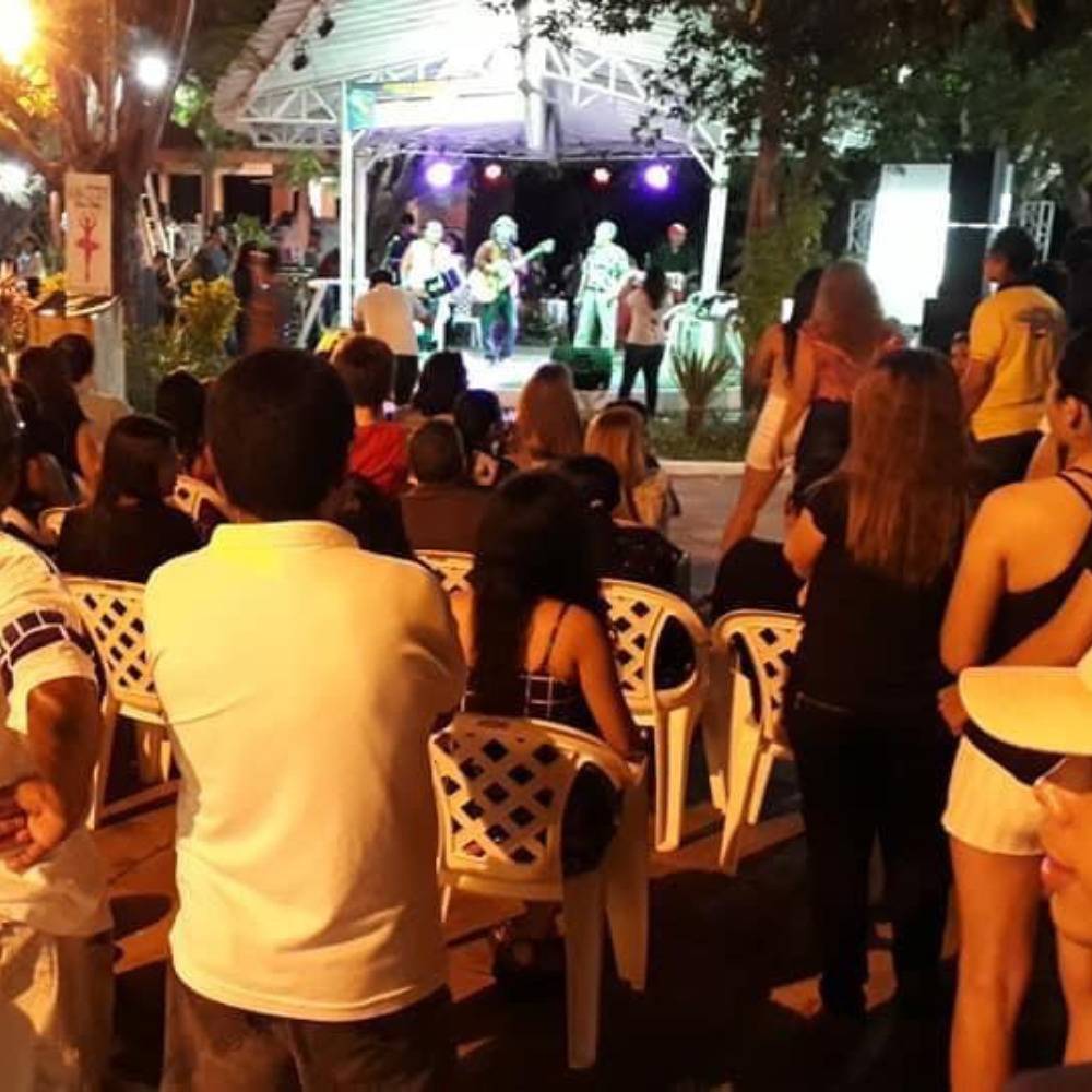 Foto da praça à noite cheia de pessoas sentadas assistindo às apresentações. Foto da praça à noite cheia de pessoas sentadas assistindo às apresentações.
