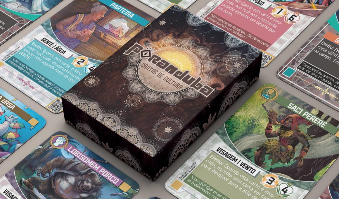 “Poranduba – Cartas de Cultura” é um jogo de cartas estratégico, inspirado na cultura popular brasileira, para uma a quatro pessoas. Planejado para públicos a partir dos 12 anos de idade, traz como objetivo vencer três desafios antes do seu oponente. Para isso, você deve utilizar a sabedoria das benzedeiras; a força dos lobisomens ou a ginga dos palhaços de folia de reis. Só cuidado: um movimento em falso e suas cartas podem ir para o Beleléu!