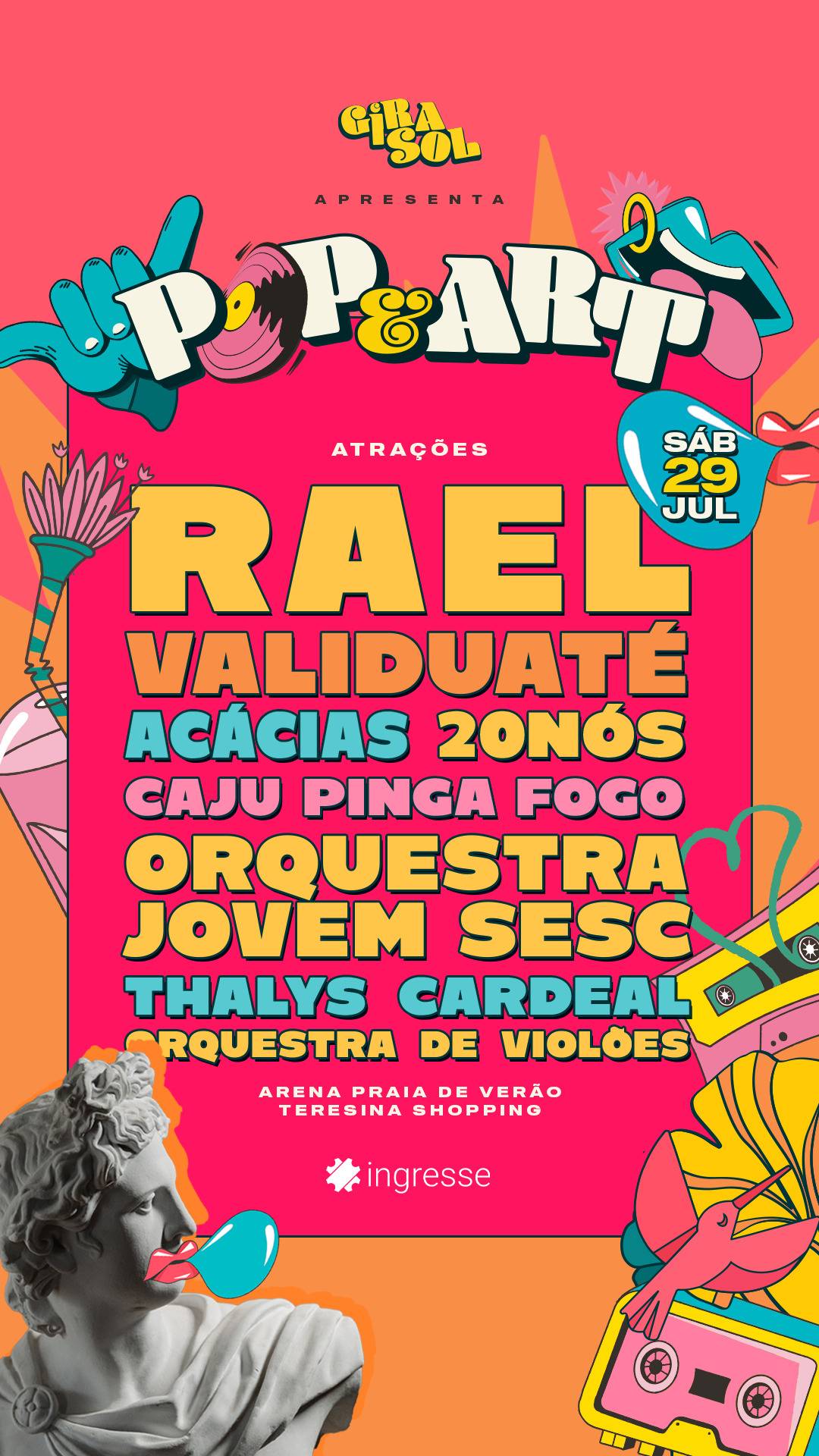 Focando na valorização da arte, cultura e da música piauiense, o Festival GiraSol realiza o Pop&Arte, uma prévia que acontece sábado, 29 de julho, na Praia de Verão do Teresina Shopping. Um dos destaques será a música instrumental, representada pela Orquestra Jovem do Sesc, a Orquestra de Violões de Teresina, o violonista Thalys Cardeal e da Caju Pinta Fogo. Também irão se apresentar o cantor Rael e as bandas Acácias, 20nós e Validuaté.