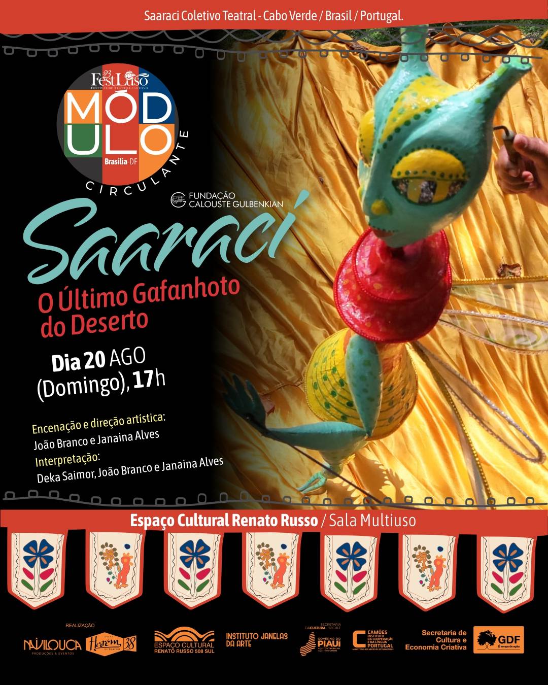 Numa viagem cheia de aventuras, o Gafanhoto Saaraci, o último do deserto, nos leva a grandes descobertas, onde se cruza com outros companheiros da natureza, na sua viagem louca até a ilha do Gigante Adormecido. Esta produção coloca em cena, de forma criativa e alegre, o incrível telúrico mundo da artista plástica luso-caboverdiana Luísa Queirós. Um espetáculo que levará as crianças a pensarem sobre a preservação ambiental e animal e que utiliza múltiplas técnicas diferenciadas, desde a forma animada, com uma belíssima marioneta que encarna o nosso protagonista, até técnicas de contação de estóreas, utilização de máscaras e sombras chinesas. Lúdico divertido e criativo!