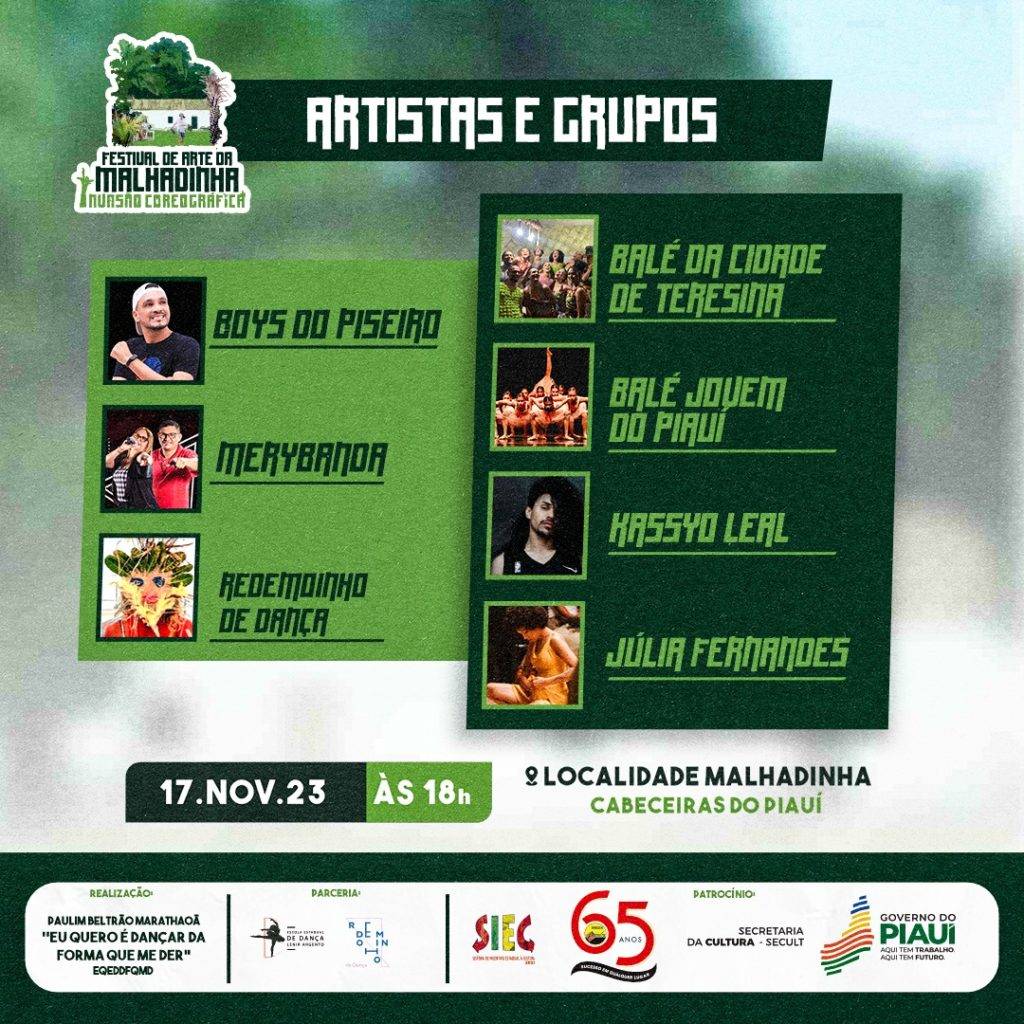 O festival ocorrerá às margens do Rio Marathaoã, na localidade Malhadinha, e contará com a presença dos artistas e convidados: Balé da Cidade de Teresina, Balé Jovem do Piauí, Júlia Fernandes, Kassyo Leal, MeryBanda e Redemoinho de dança. O evento é gratuito e aberto a público de todas as idades.