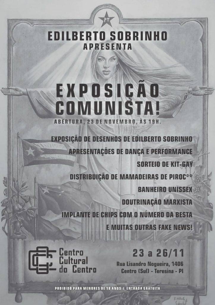 No próximo dia 23 de novembro, às 19h, no Centro Cultural do Centro (@centroculturaldocentro) , o artista visual Edilberto Sobrinho (@edilbertosobrinhoarte) apresentará ao público a “Exposição Comunista”. O evento promete não apenas deslumbrar os amantes da arte, mas também desafiar os limites do convencional com performances, danças e muita provocação, unindo elementos que o artista mais gosta de fazer: blasfemar, fazer críticas sociais e criticas ao moralismo.