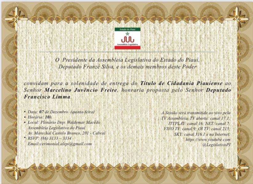 O escritor pernambucano e idealizador da Balada Literária, Marcelino Freire, recebe nesta quinta-feira (7) o título de “Cidadão Piauiense”. Indicado pelo autor da proposição, deputado Francisco Limma, Marcelino recebe o título em solenidade no Plenarinho da Assembleia Legislativa do Estado do Piauí (Alepi), às 9h30, pelos relevantes serviços prestados à cultura do Estado.