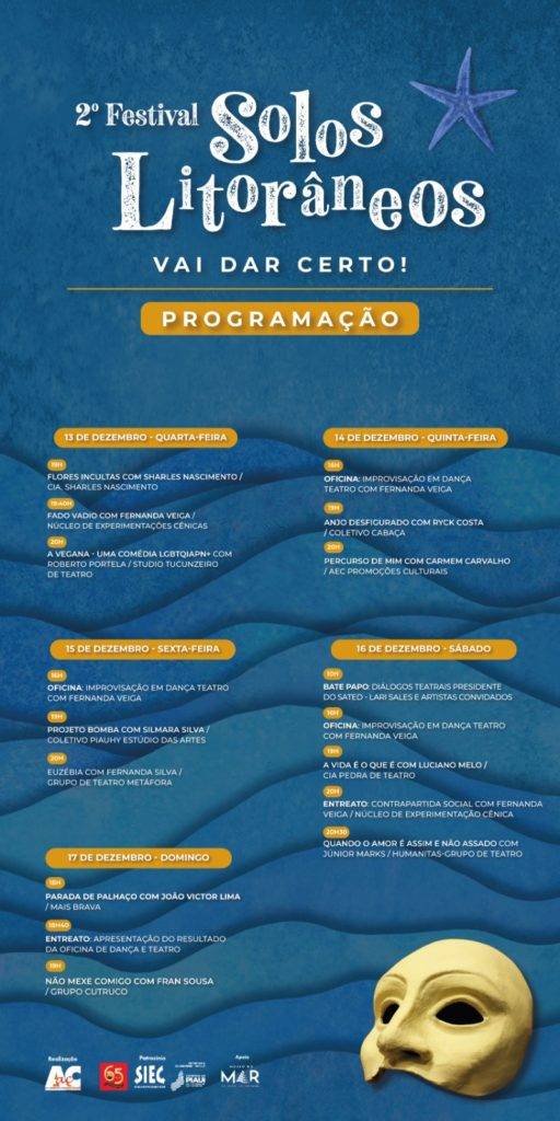 O Museu do Mar sediará o 2º Festival Solos Litorâneos em Parnaíba, entre os dias 13 e 17 de dezembro. O evento, que aborda a temática “Vai dar certo!”, oferecerá uma oficina de Improvisação em Dança-Teatro ministrada por Fernanda Veina. Os espetáculos, diversificados para atender a todos os gostos, requerem apenas a doação de 1 pacote de absorvente como entrada, destinado ao projeto Pobreza Menstrual PHB.