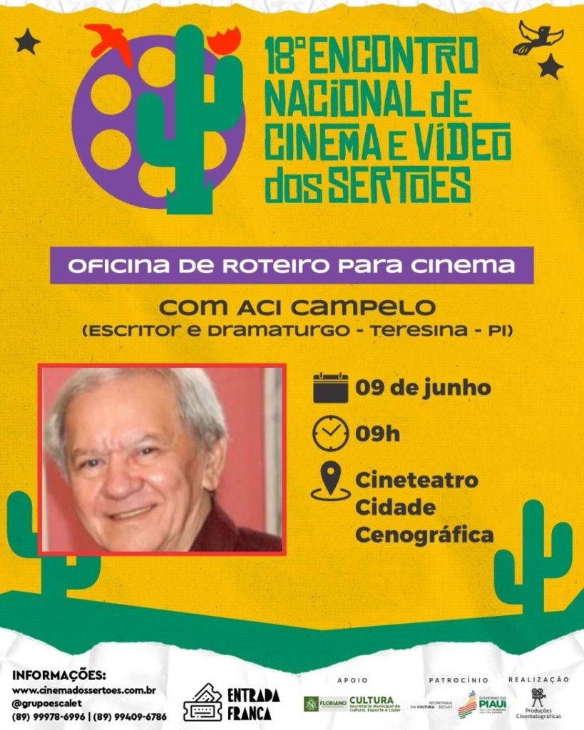 Já a Oficina de Roteiro para Cinema será ministrada pelo escritor e dramaturgo Aci Campelo, de Teresina (PI), no dia 9 de junho, a partir das 9h, no Cineteatro da Cidade Cenográfica. Aci explica que os participantes da oficina irão conhecer as técnicas de construção de um roteiro cinematográfico, além da prática de habilidades na escrita.