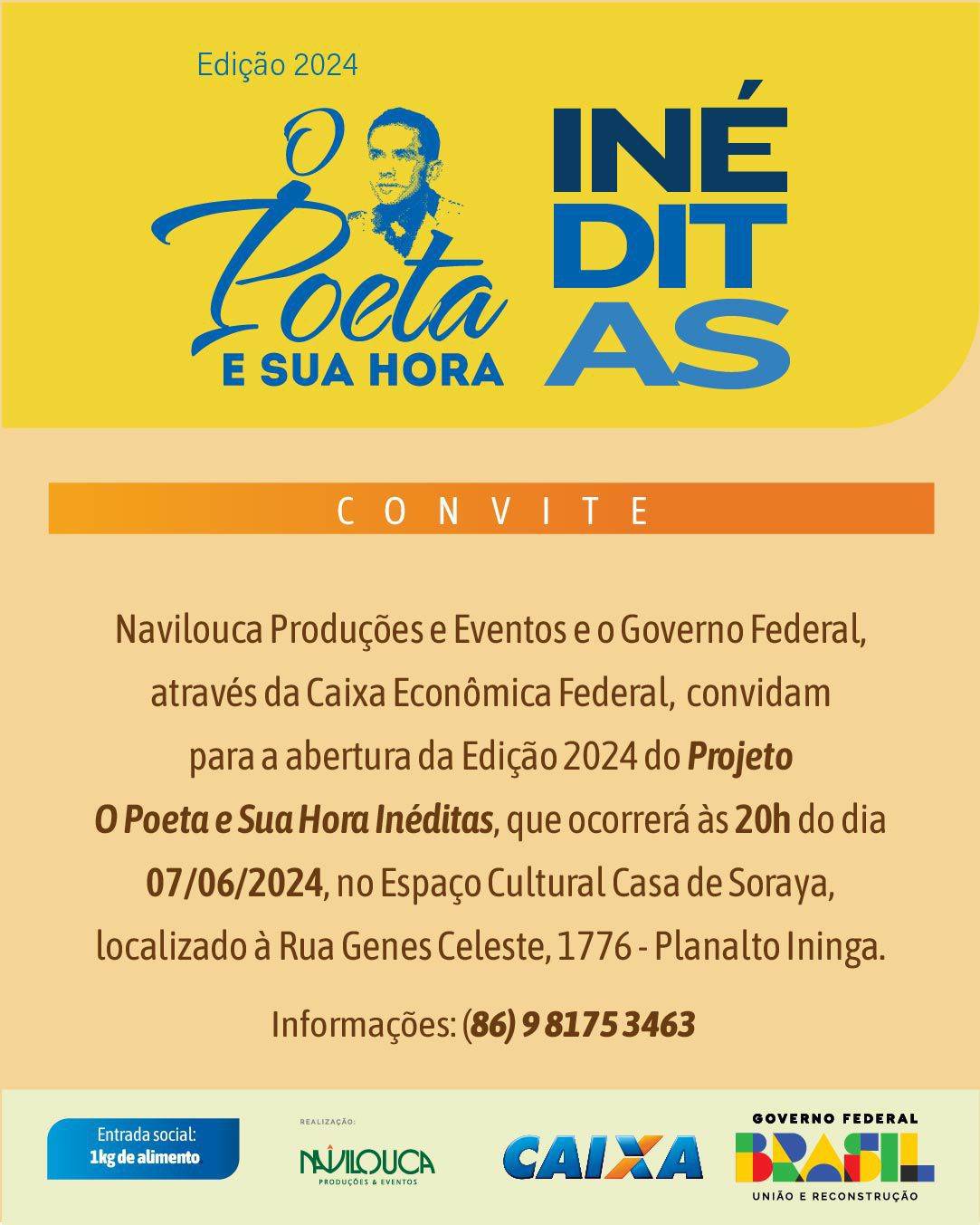 A entrada social é apenas 1kg de alimento não perecível. O Poeta e sua Hora – Inéditas tem produção executiva de Soraya Guimarães, direção artística de Arimatan Martins. A realização é da Navilouca Produções. Patrocínio: Caixa e Governo Federal. Apoio: Grupo Harém de Teatro.