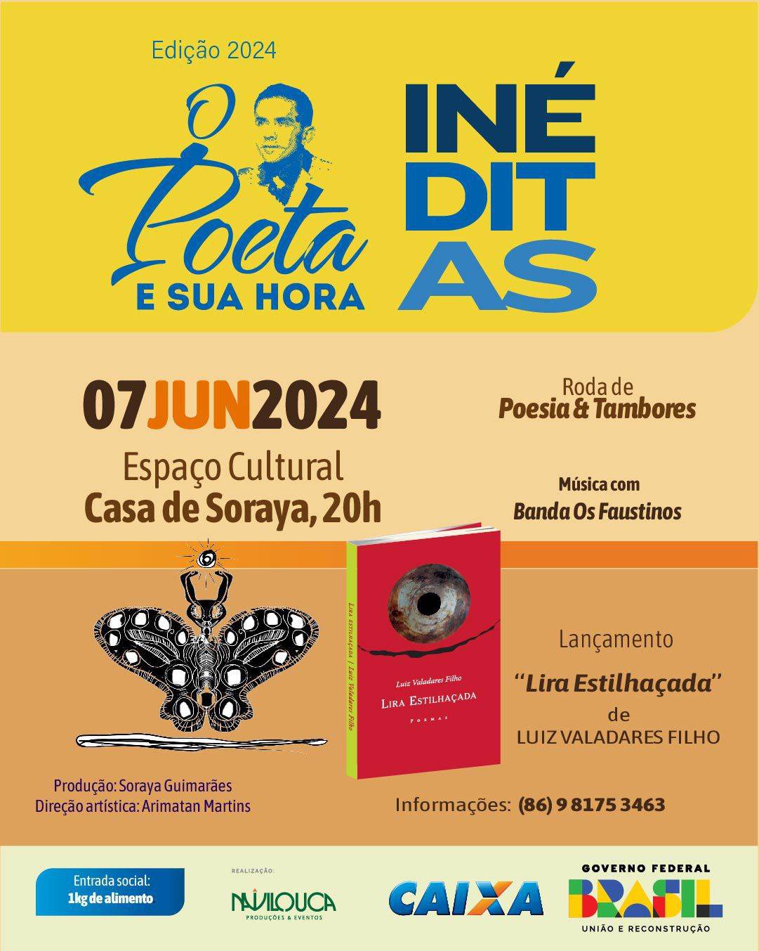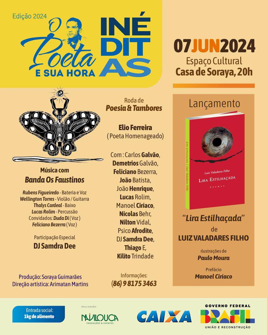 A noite já começa com o lançamento do livro Liras Estilhaçadas, do escritor e poeta Luiz Valadares Filho, com noite de autógrafos. Com patrocínio da Caixa e do Governo Federal, O Poeta e sua Hora – Inéditas terá entre uma atração e outra o repertório eclético e animado com Os Faustinos, que já estão a todo vapor nos ensaios para a apresentação, tendo ainda como convidados para o apoio vocal Duda Di e Feliciano Bezerra.