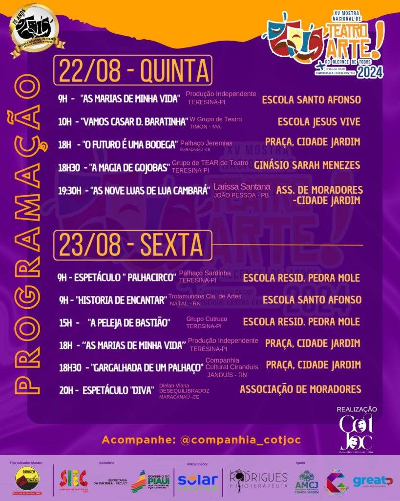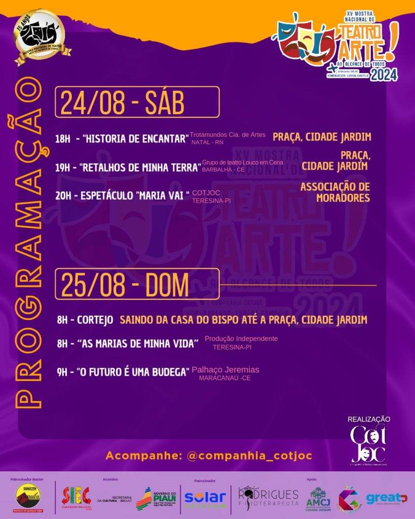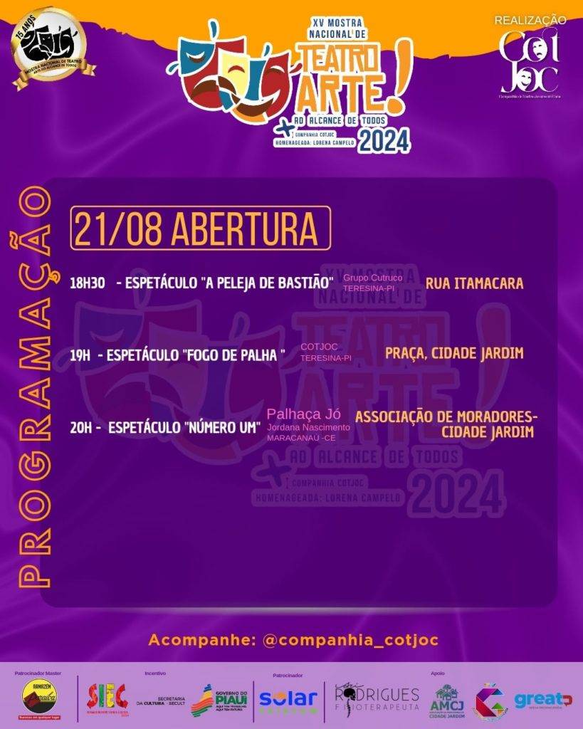A XV Mostra Nacional de Teatro – Arte ao Alcance de Todos promete, mais uma vez, ser um marco na valorização da cultura e da arte nas periferias de Teresina, reafirmando o compromisso da COTJOC com a inclusão cultural e o acesso universal ao teatro.