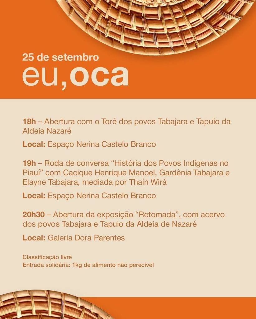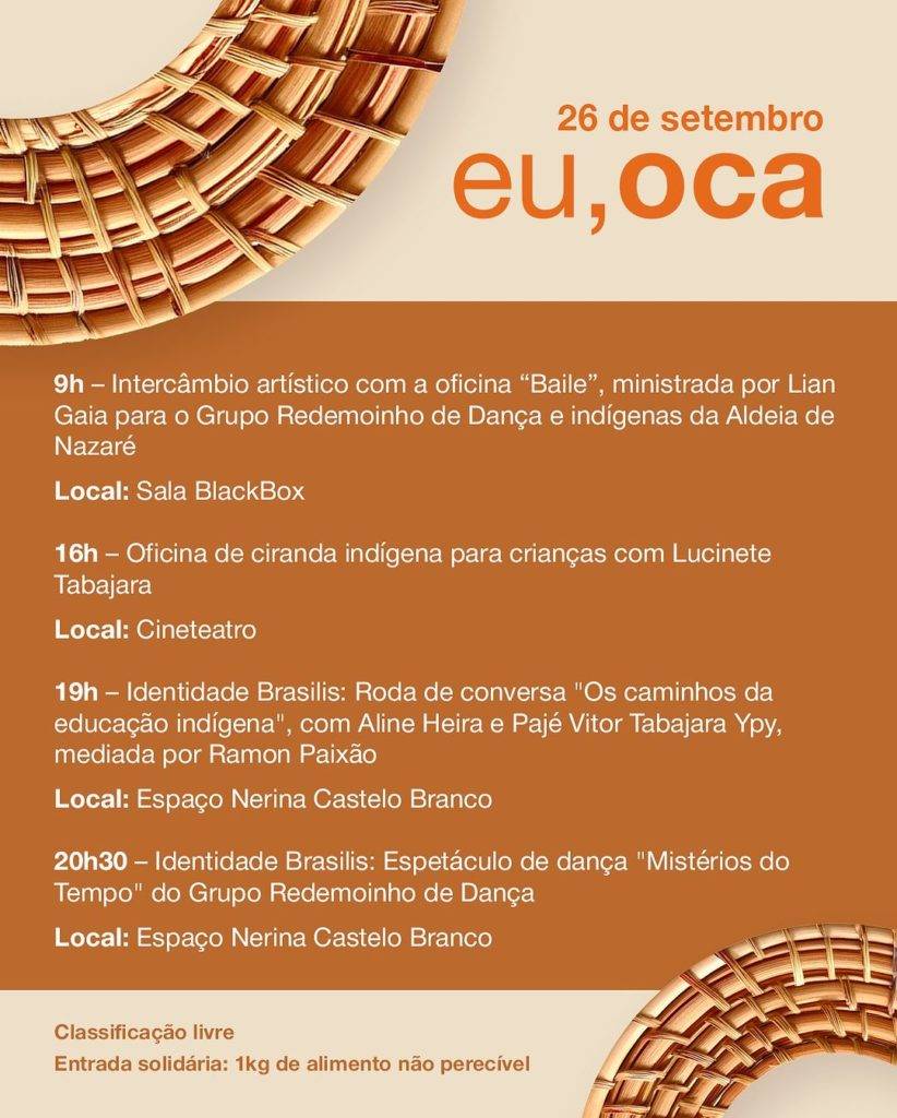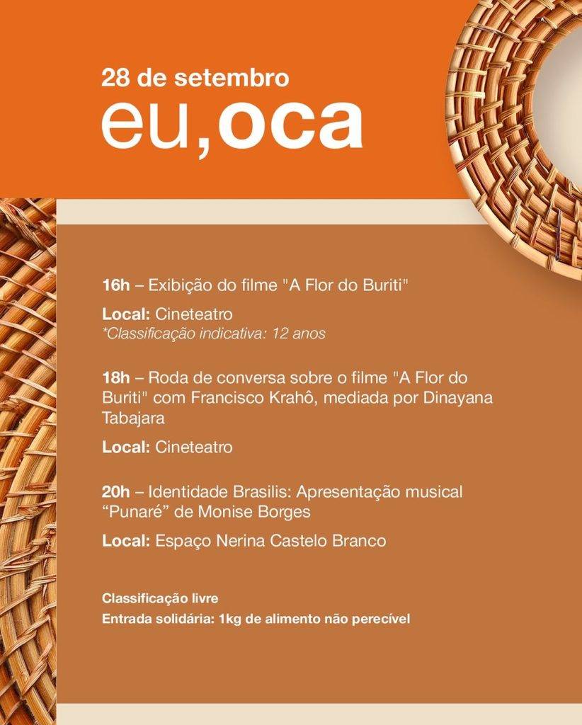 O “Eu, Oca” é um projeto que tem o objetivo de valorizar as manifestações culturais dos povos indígenas. A programação deste ano acontece de 25 a 28 de setembro com o tema “É tempo de retomada”.