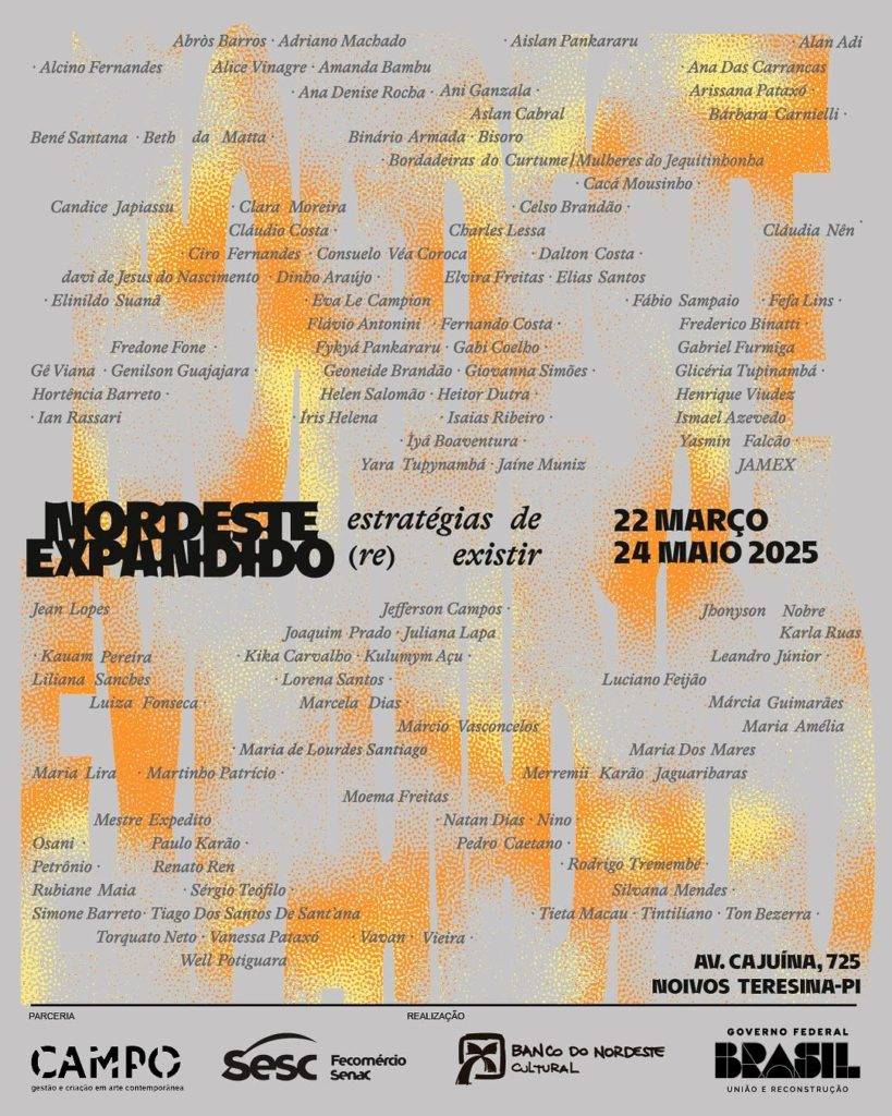 O seminário de abertura do Nordeste Expandido: estratégias de (re)existir ocorrerá, durante os dias 20 a 22 de março, no centro cultural CAMPO Arte, na zona Leste de Teresina (PI). Após as rodas de conversa, a exposição acontecerá de 22 de março a 24 de maio, das 10h às 20h, no SESC Cajuína, também na zona Leste da capital.