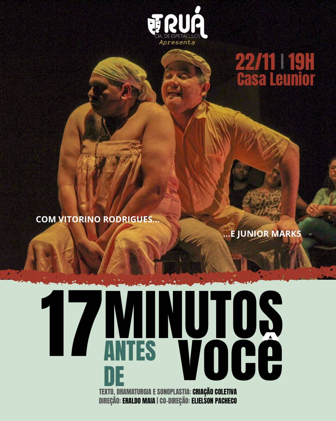 O espetáculo “17 MINUTOS ANTES DE VOCÊ” entra em cartaz dia 22 de novembro, às 19h, no Espaço Cultural Casa Leunior, em Timon-Ma. A apresentação é comemorativa de 18 anos da companhia – Truá Companhia de Espetáculos – que marcou seu início em novembro de 2007, com o início deste espetáculo, que estrearia mais tarde, já no ano seguinte.