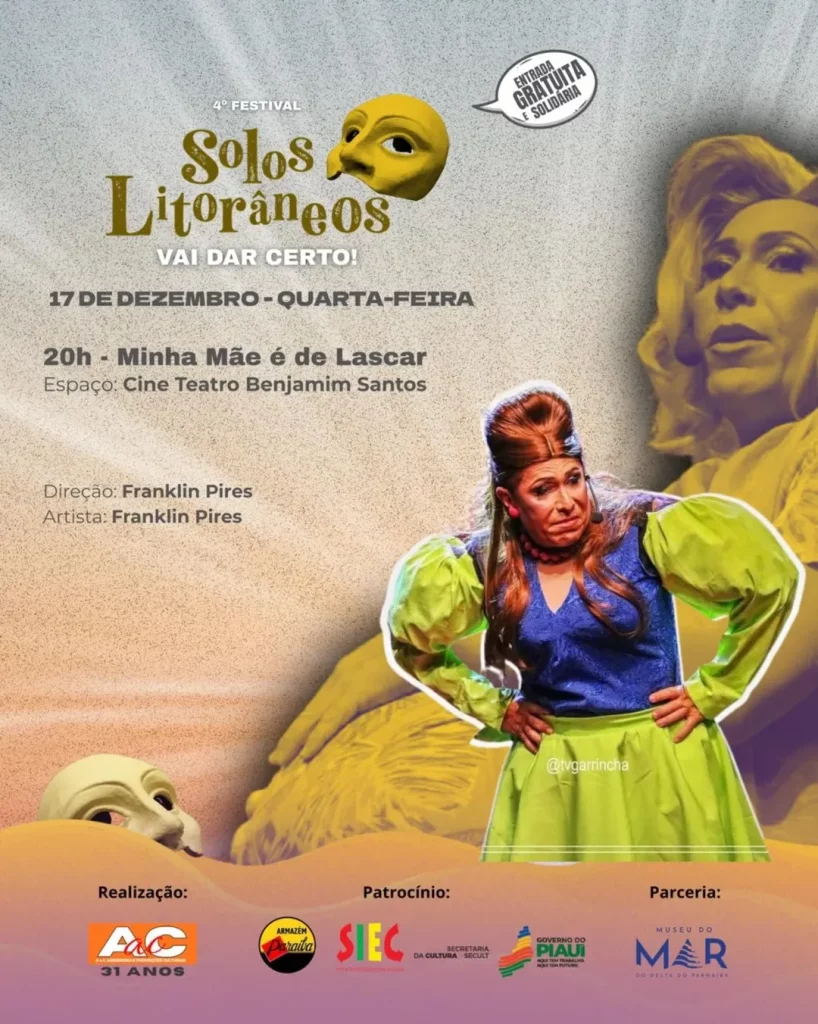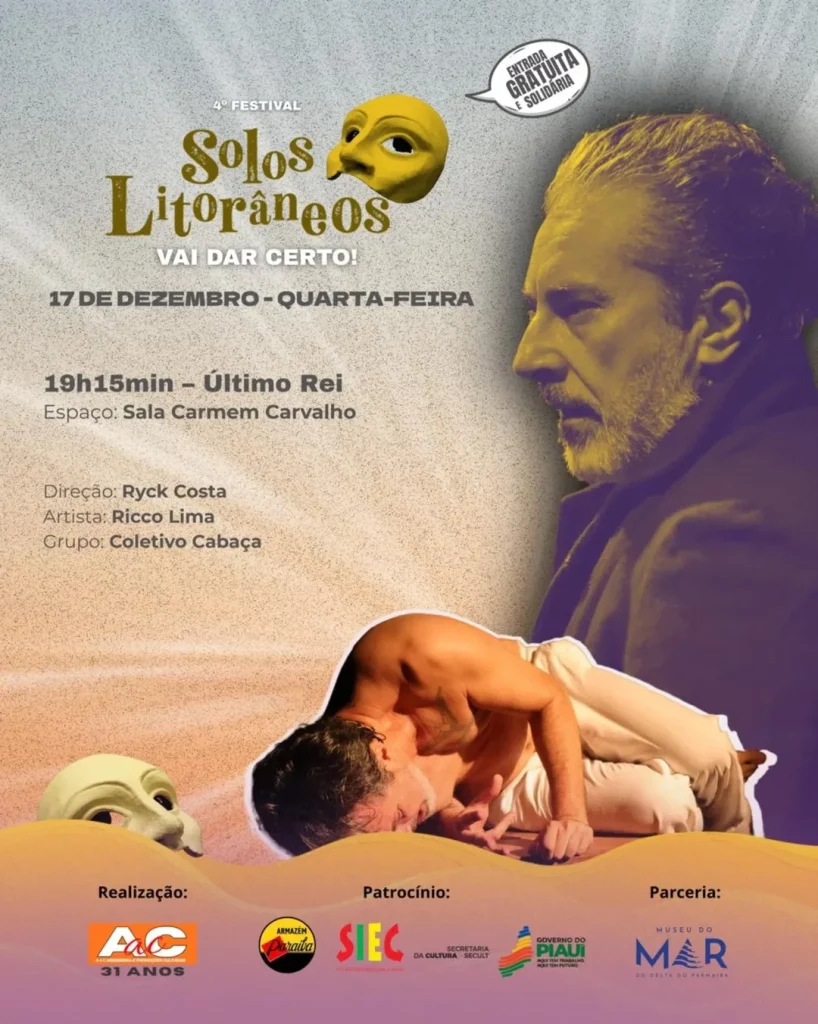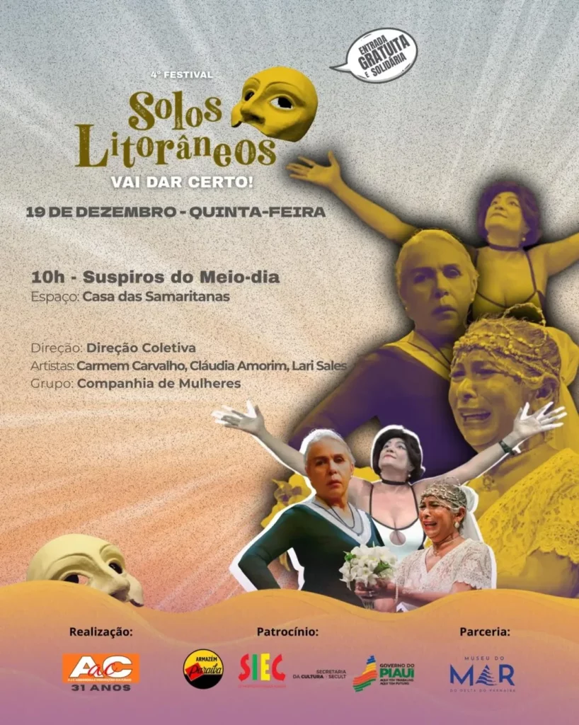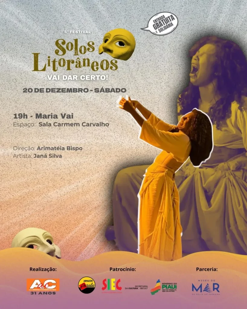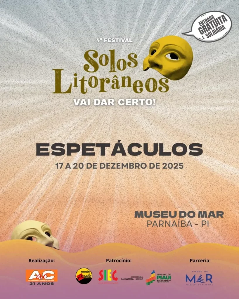 O 4º Festival Solos Litorâneos – Vai dar certo! divulgou sua programação completa. O festival, que acontece de 17 a 20 de dezembro, em Parnaíba (PI), promove uma maratona de espetáculos teatrais solo, performances e atividades formativas, todos com acesso gratuito. As apresentações ocorrerão em diversos espaços culturais da cidade, com o Museu do Mar como epicentro.
