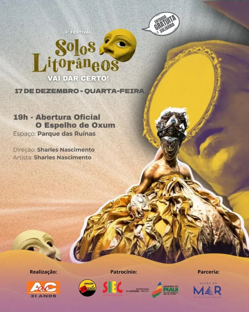 A abertura oficial está marcada para 17 de dezembro (quarta-feira), às 19h, no Parque das Ruínas, com o espetáculo “O Espelho de Oxum”, dirigido e interpretado por Sharles Nascimento. A noite segue com outras apresentações no Cine Teatro Benjamim Santos e na Sala Carmem Carvalho.