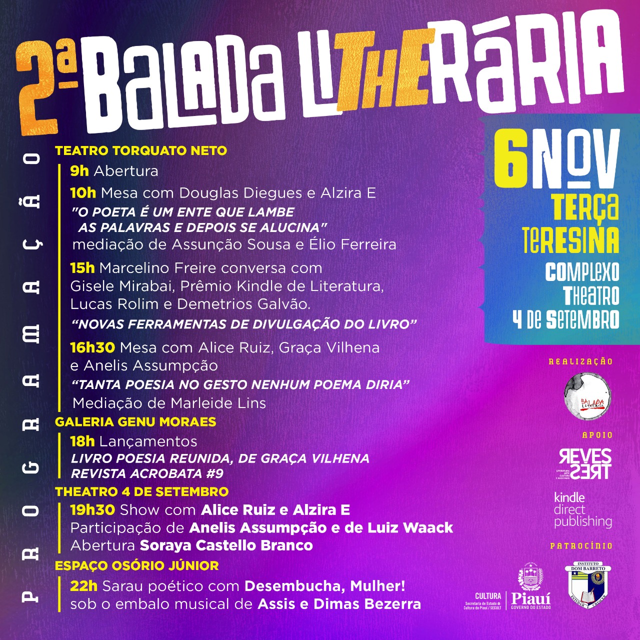 Balada Literária em Teresina, nesta terça-feira (06). Olha que programação maravilhoso durante todo o dia no complexo do Theatro 4 de Setembro, a partir das 09hrs.