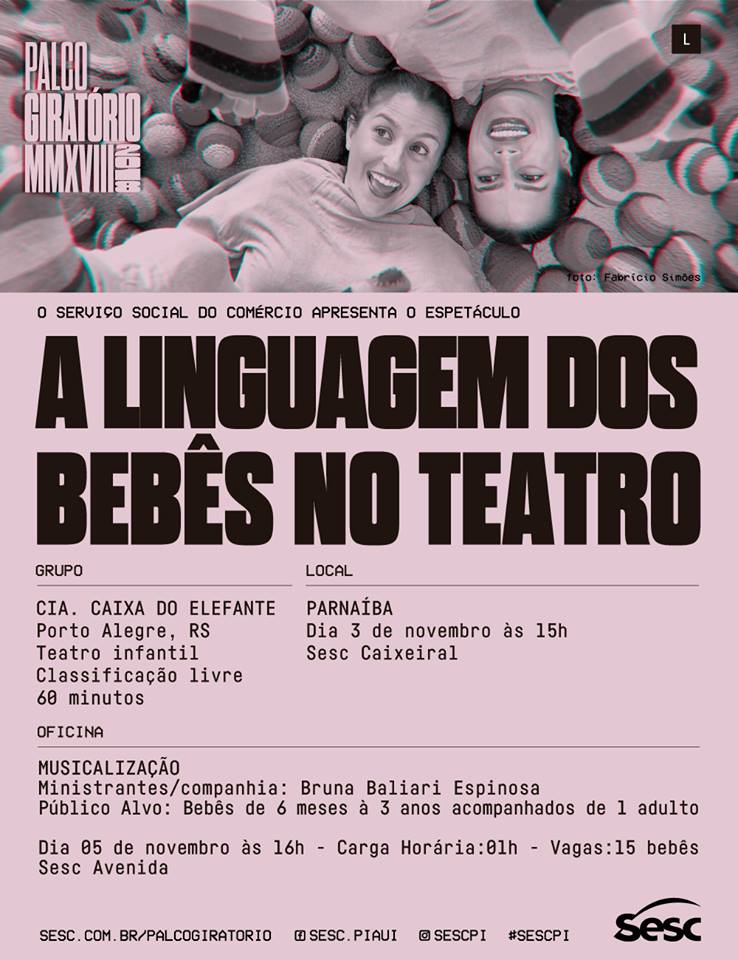 O último espetáculo do ano do Palco Giratório será a peça infantil “A linguagem dos Bebês no Teatro”, da Companhia Caixa do Elefante (RS), apresentado em Teresina, Floriano e Parnaíba. A classificação é livre e a entrada é 1kg de alimento não perecível. Durante a peça as fronteiras do tempo, das formas e dos sentidos se intercambiam entre o real e o imaginável, entre o possível e o surreal. Essa é a atmosfera criada pelo espetáculo, como um jogo entre o esconder e o revelar, em meio a experiências lúdicas e estéticas dos bebês.