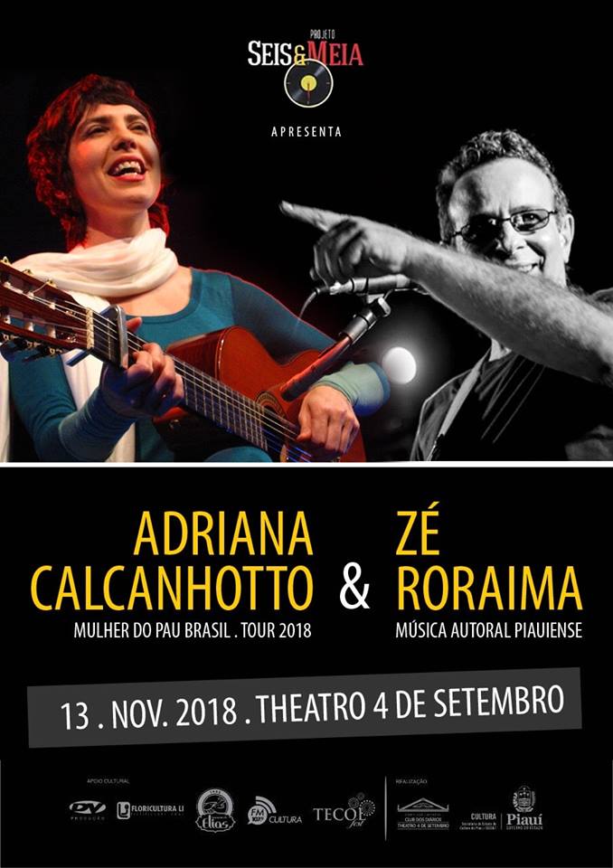 Hoje no Projeto Seis & Meia tem o show “A Mulher do Pau Brasil”, de Adriana Calcanhotto, com abertura de Zé Roraima com seu Pop Bossa Nova autoral, a partir das 18h30, no Theatro 4 de Setembro.