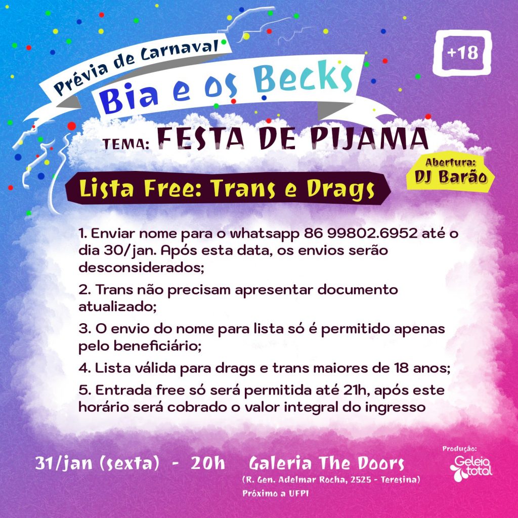 A Banda Bia e Os Becks, que neste ano será uma das atrações do maior bloco de carnaval de Teresina, o Sanatório Geral, promove mais uma prévia de carnaval. O novo show da banda vem com a pegada totalmente despudorada, será uma festa de pijama. Dia 31 de janeiro será aquela sexta para soltar as suas feras, pois a festa que começará às 20h será aberta pelo DJ Barão, do baile Afrosamurai, na Galeria The Doors (Rua Gen. Adelmar Rocha, 2525 – Teresina) que fica localizada próximo à UFPI.