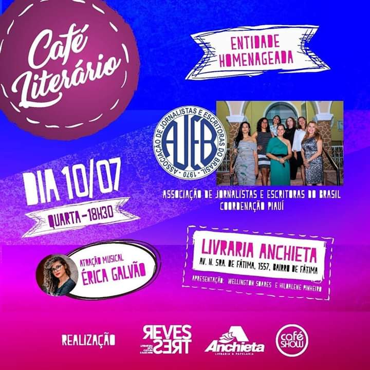 Hoje, 10 de julho, o Café Literário trás com entidades homenageadas as escritoras da AJEB/PI e a música ficará por conta de Érica Galvão. O evento acontece na Livraria Anchieta, a partir das 18h30. Não fique de fora dessa!!!