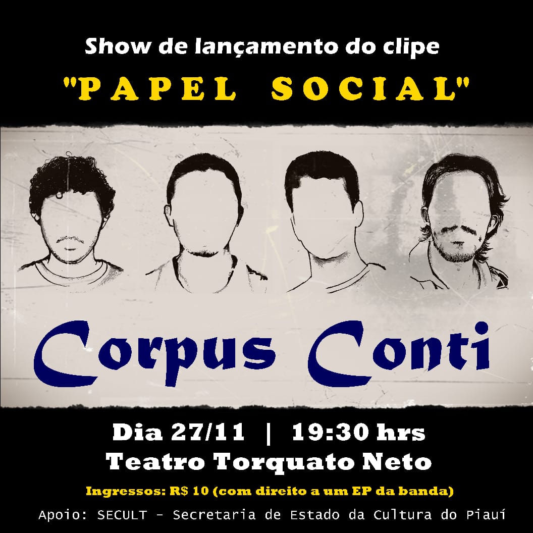Hoje(27/11), terá show de lançamento do vídeo clipe “Papel Social” da banda Corpus Conti, no Teatro Torquato Neto, a partir das 19h30.