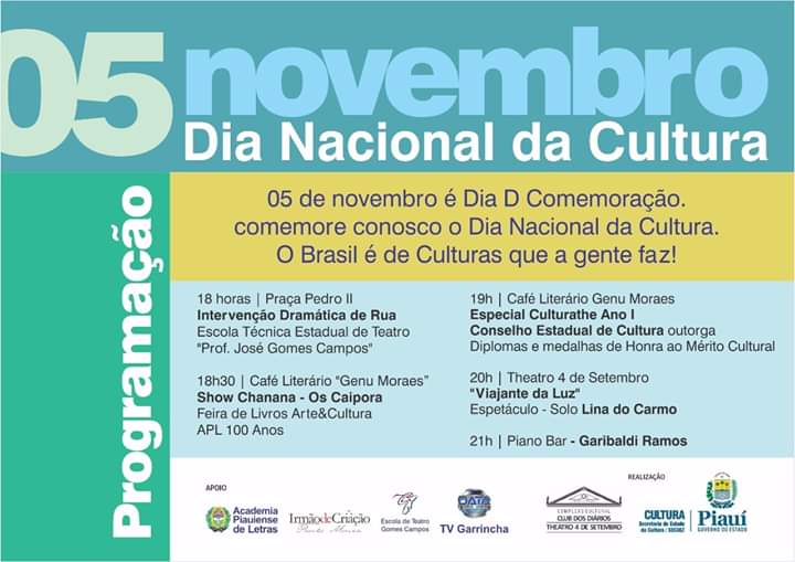 Hoje, 05 de novembro, logo mais, a partir das 18hrs, é dia de comemorar o “Dia Nacional da Cultura”. O evento será no Theatro 4 de Setembro, Café literário “Genu Moraes” e Praça Pedro II. Não fique de fora dessa!!