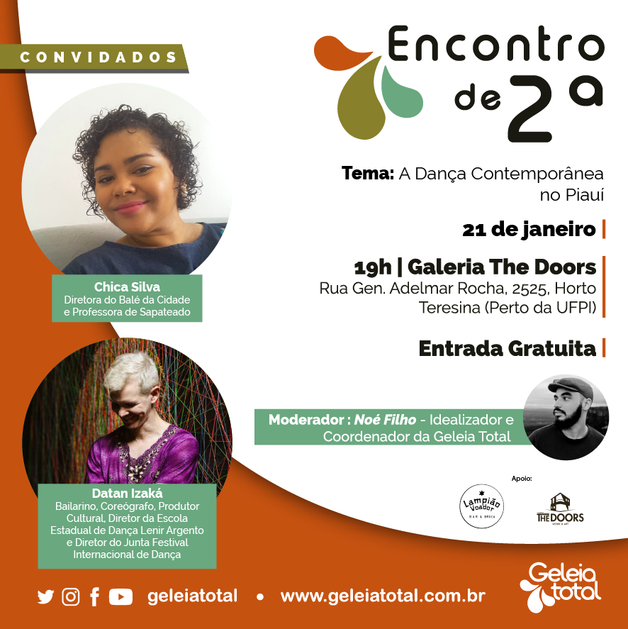 O próximo Encontro de 2ª será sobre o fazer da dança contemporânea no Piauí, com Chica Silva, Diretora do Balé da Cidade e Professora de Sapateado, e Datan Izaká, bailarino, coreógrafo, produtor cultural, Diretor da Escola Estadual de Dança Lenir Argento e Diretor do Junta Festival Internacional de Dança.