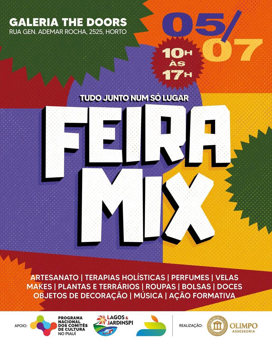Neste sábado, 5 de julho, a Galeria The Doors, localizada no bairro Horto, em Teresina, recebe mais uma edição da Feira Mix, evento que reúne expositores e empreendedores de diferentes segmentos em um único espaço. A programação acontece das 10h às 17h, com entrada gratuita.