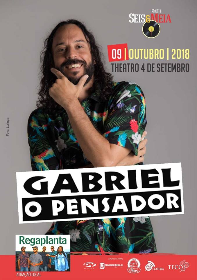 Dia 09 de outubro, no Theatro 4 de Setembro, às 18h30, o Projeto Seis e Meia trás o cantor Gabriel O Pensador. As vendas dos ingressos está ocorrendo na bilheteria do Theatro, a partir das 8 hrs da manhã. Maiores informações 988172201