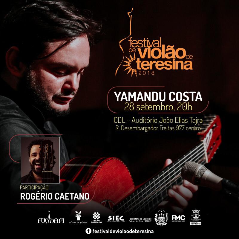 Com uma programação gratuita, a II edição do festival de violão de Teresina tem a proposta de expandir o segmento musical na capital. Seguindo o objetivo de fomentar os músicos e interessados através de recitais, masterclass e intercâmbio cultural. O Festival será entre os dias 28, 29 e 30 de setembro. E Hoje a abertura será no CDL- Auditório Jesus Elias Tajra Filho, a partir das 19hrs, tendo na programação, cerimônia de abertura às 19hrs, Orquestra de Violões de Teresina às 19h30 e às 20hrs a presentação do Yamandu Costa com participação de Rogério Caetano.