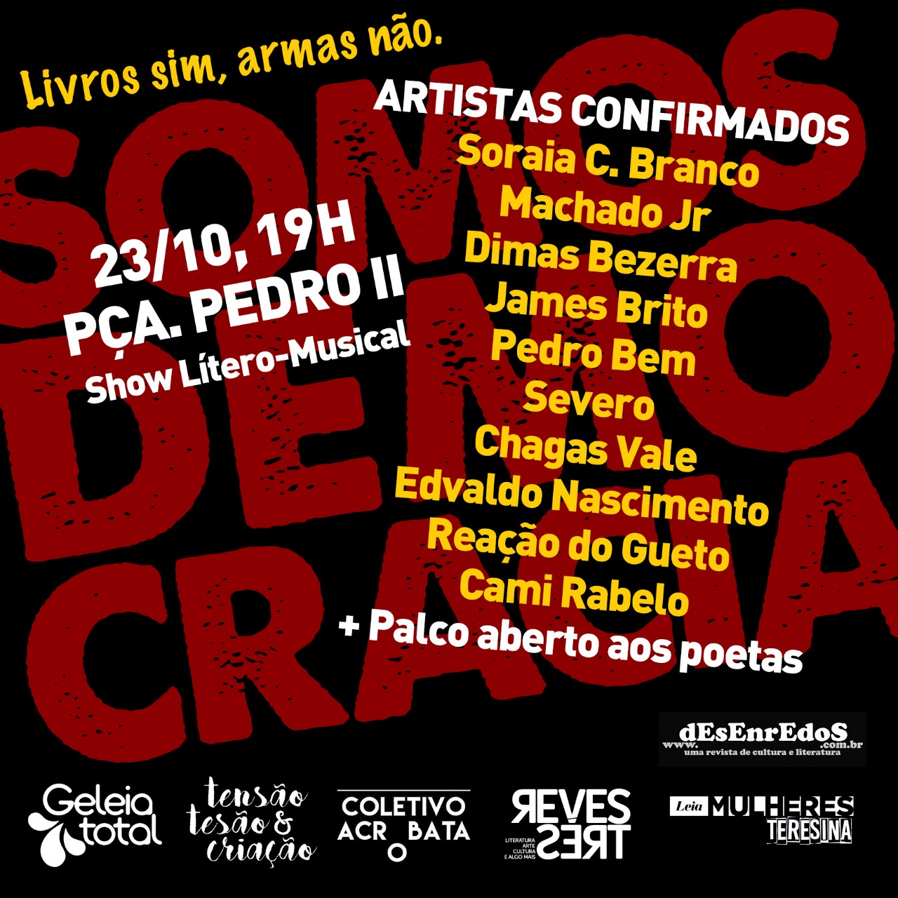 “Organizado pelas revistas Revestré , Desenredos e Acrobata e pelos coletivos culturais Leia Mulheres, Geleia Total e Tensão, Tesão & Criação, o evento marca o posicionamento dos grupos frente a atual conjuntura política. Livros sim, armas não. Esse é o lema do ato lítero-musical em favor da democracia que acontece nesta terça-feira (23) na Praça Pedro II, com shows musicais e recital de poesia. Dentre as atrações estão Soraya Castello Branco, Chagas Vale, James Brito, Edvaldo Nascimento, Severo, Dimas Bezerra, Machado Júnior, Reação do Gueto e Pedro Ben.”
