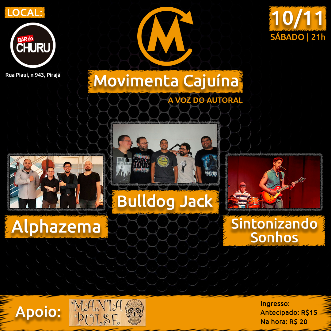 O Movimenta Cajuína é um evento que surgiu com a proposta de dar voz, espaço para bandas autorais da cidade mostrarem seu trabalho. Idealizado e organizado por Érica Galvão e Wonnack. E neste sábado (10/11) o Movimenta Cajuína trás as bandas Bulldog Jack, Sintonizando Sonhos, e Alphazema, para sua segunda edição. O evento acontecerá no Bar do Churu, a partir das 21hrs. Ingressos à venda no Centro Musical do Riverside e diretamente com as bandas, no valor antecipado: R$ 15,00 (valor promocional) e na hhora do evento R$ 20. Link para download de 9 músicas autorais das bandas: https://goo.gl/yzsY5J