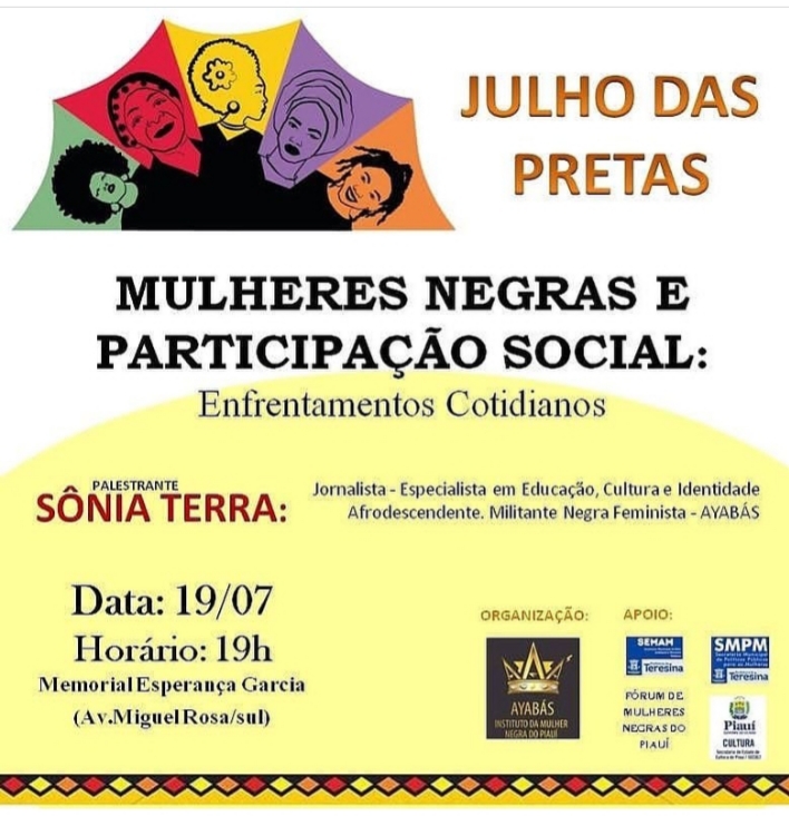 Hoje, no Memorial Esperança Garcia, a partir das 19hrs, terá a palestra ” Mulheres Negras e Participação Social: Enfrentamentos Cotidianos”, com a palestrante Sônia Terra (Jornalista e Especialista em Educação, Cultura e Identidade Afrodescendentes). Não fique de fora dessa!!!