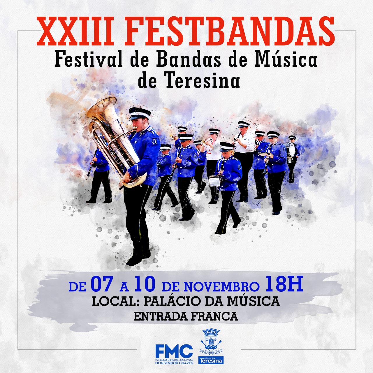 Reunindo bandas de todos os tipos, desde os iniciantes até os avançados, a Fundação Municipal de Cultura Monsenhor Chaves (FMCMC) apresenta nesta quarta-feira (07) o XXIII Festival de Bandas de Música de Teresina. O evento é gratuito e acontece a partir de hoje ate dia 10 de novembro, com início às 18h, no Palácio da Música.