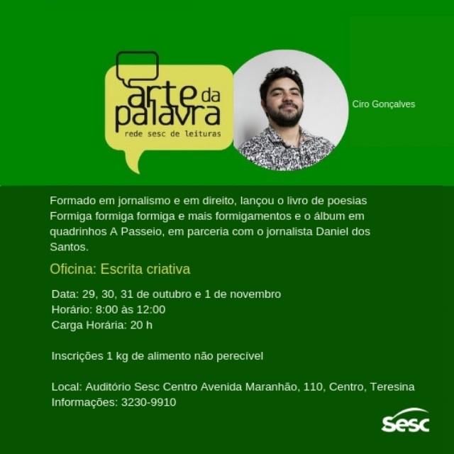 O Sesc convida você para a “Oficina Escrita Criativa” com o escritor Ciro Gonçalves. Essa oficina é para quem quer explorar a escrita e a estrutura narrativa, e principalmente para quem gosta de ler e escrever, tendo na literatura um meio de prazer. A oficina será nos dias : 29, 30 e 31 de outubro e 1 de novembro, das 8hrs às 12hrs. As inscrições será 1kg de alimento não perecível.
