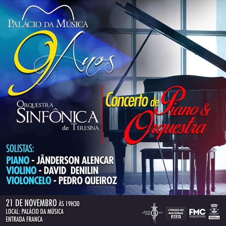 Nos dias 21 e 22 de novembro, o Palácio da Música realiza uma super festa em comemoração por seus 09 anos de existência desde sua inspiração em 2009. E a Orquestra Sinfônica de Teresina não poderia deixar de estar na nesta programação, aproveitando para realizar o concerto de inauguração de seu piano, na quarta-feira, dia 21. Será às 19h30 com entrada franca.