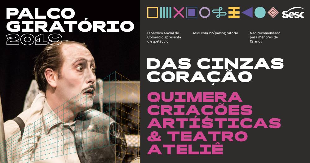 O primeiro espetáculo do Palco Giratório 2019 no Piauí será “Das Cinzas Coração”, do grupo Quimera Criações Artísticas Quimera Criações Artísticas & Teatro Ateliê (RS). As apresentações acontecem em Teresina, Floriano e Parnaíba juntamente com uma oficina em cada cidade. A entrada é 1kg de alimento não perecível e a classificação é livre.