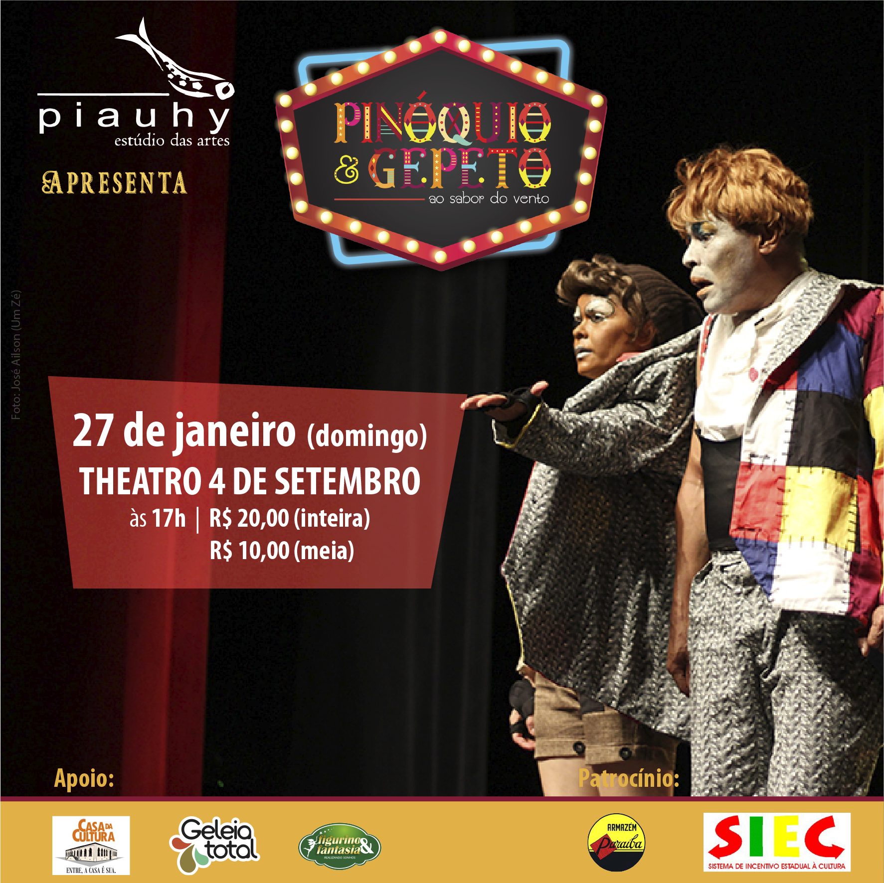 “Pinóquio e Gepeto ao Sabor do Vento” é uma adaptação dramatúrgica de Adriano Abreu para o texto original de Carlo Collodi (As Aventuras de Pinóquio – História de Uma Marionete). A peça inova a cena infanto-juvenil do Teatro Brasileiro de Expressão Piauiense, conceitual, técnica e esteticamente, abordando artisticamente um dos maiores textos da literatura universal. O elenco do espetáculo traz a primeira montagem para crianças e jovens do Coletivo Piauhy Estúdio das Artes, grupo que é referência de grandes espetáculos no Piauí e fora dele. A temática abordada é a descoberta do mundo pela “criança boneco”, e a sua relação com o seu criador e pai, Gepeto.